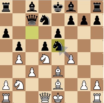In de opening mocht ik meteen aan de bak. Na een stukoffer van mijn tegenstander. Wit heeft twee zetten na 13 .. Pcxe5. 14. 0-0. maar vond ik een beetje speculatief. In de berekening van 14. fxe5 Dxc3+ 15. Dd2 Lxb4 vond ik de spectaculaire zet 16. Pc6!! die de boel bij elkaar houdt. Omdat wit na 16… Dxb2 (of 16 .. Dxe3) 17. Dxb4 Mat op e7 dreigt. Dus koos ik voor 14. fxe5.