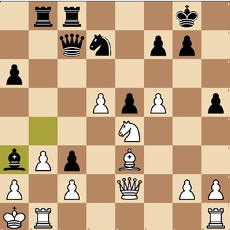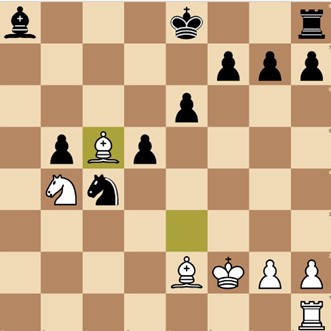 Mijn tegenstanden speelde niet zo heel nauwkeurig en ik wist mijn stelling bij elkaar te houden door de coördinatie van mijn tegenstanders stukken te verhinderen tot dit diagram waarin mijn tegenstander 23 … f6?? speelt.