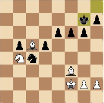 Bord 3) Peter van den Bergh (2089) – Ramon Jessurun (2080) 0,5-0,5 Ramon kwam op zijn 24e zet naar mij toe met een remiseaanbod op zak. Een snelle blik op de overige borden resulteerde in een doorspeel-advies. Ramon had volgens eigen zeggen ook een stelling waarmee dat heel goed mogelijk was. En ik vond dat we er niet goed voorstonden op dat moment. In ieder geval was het optische narigheid op de borden van Arjan, Michel en mijzelf. Dus doorspelen. Ramon legde daarna een prima pot op de mat en had in de cruciale fase 2 pionnen meer! In onderstaande stellig op de 42e zet wint Ramon een pion. Deze stelling is moeilijk maar wel technisch gewonnen voor zwart.