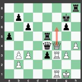 Df6+ K, Dxh8+ en dan mat in 3 met de torens. Mooi. Maar niet gespeeld.